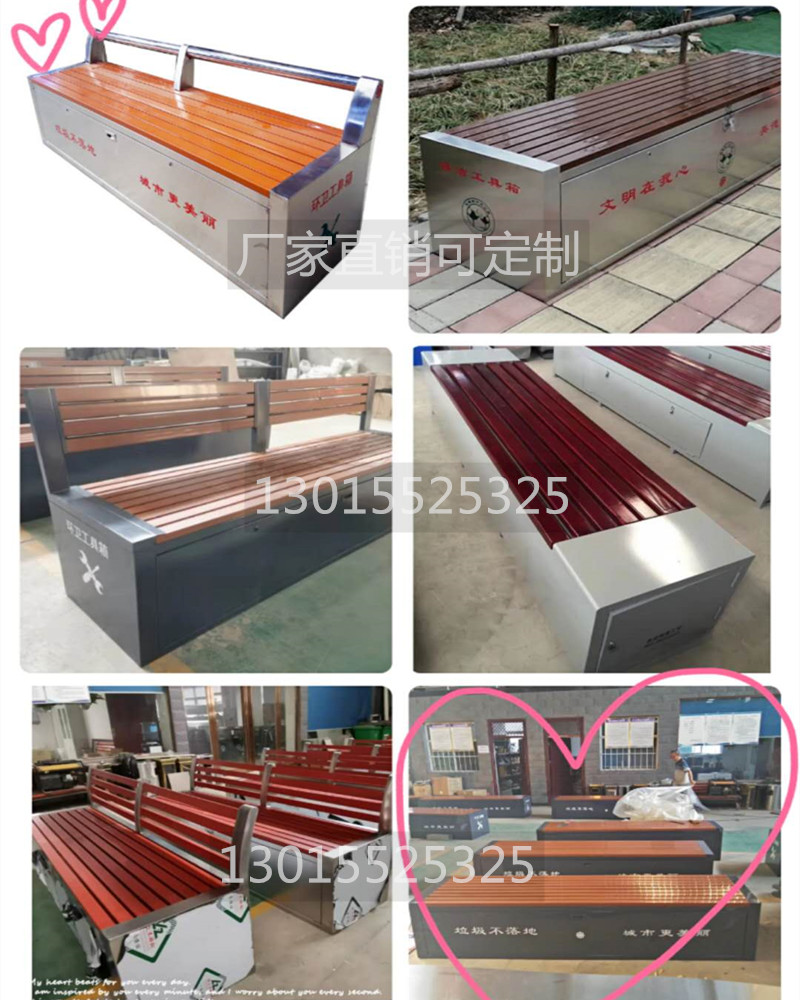 環(huán)衛(wèi)工具箱:也叫保潔員工具箱,環(huán)衛(wèi)工具座椅,保潔員休息座椅,市政保潔箱等。工具箱常用尺寸為:長2400*寬500*高550mm,也可以做成2米,2.4米,2.7米等,寬度和高度也可以定做,滿足不同客戶、不同場所的使用要求。